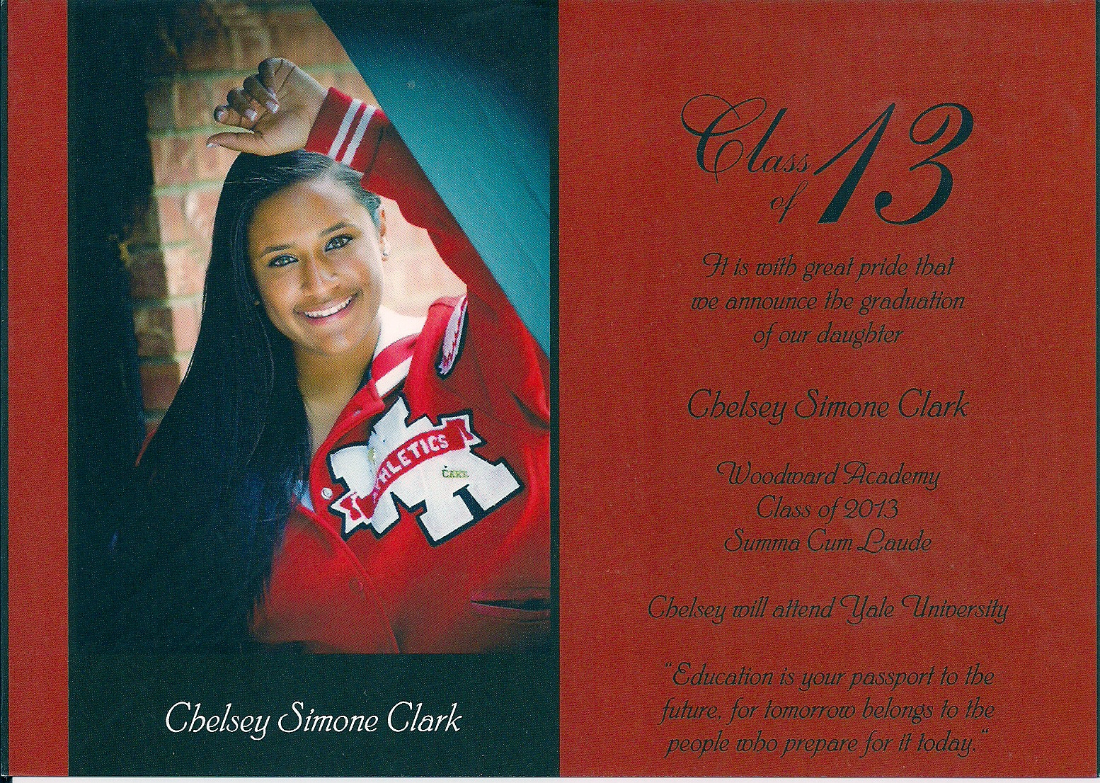 Congratulations to my cousins’ (Dr. Torey B. Clark and Ramon Burke) really great kids, Chelsey Simone Clark and Ajamu Omari Burke, whose joint Graduation Celebration is this Memorial Day Weekend, May 26, 2013. Chelsey graduated from Woodward Academy, Summa Cum Laude and will attend Yale University (and, her sister, JC, will be a sophomore at Harvard University, this Fall) and Ajamu graduated from Sandy Creek High School and will attend Morehouse College!!